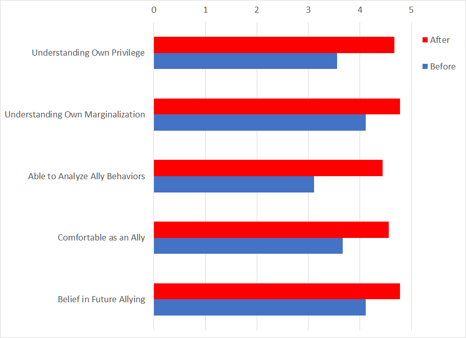 There was some good stuff. Unlike the very targeted before/after results we saw for the flagship Our Narratives workshop, we saw broadband improvements on all five of the questions we asked about our participants’ before and after experiences. But, the biggest gains were in understanding one’s own privilege (that is, understanding of one’s own privilege improved markedly, whereas improvements in understanding one’s own marginalization were more subtle), and feeling able to critically analyze one’s behaviors as an ally. So these are exactly the things we set out to do, and this preliminary data, from the first time we did the program, were very favorable. It also turns out that Keynote makes totally fetch slides, and although I used it at First Event earlier in the month, this is the first really meaty presentation I made in Keynote, and it was much more sophisticated than that prior one.